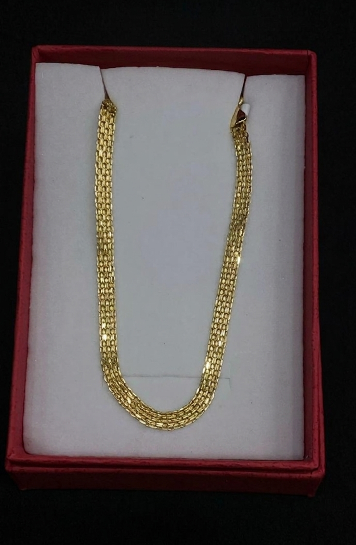 10 quilates. 18 centimetros de largo. 3.5 milimetros de grosor. 1.4 gramos. Irlandesa.